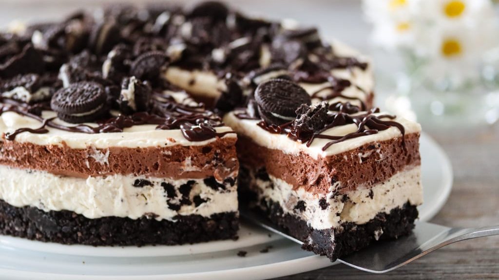 - Gjør toppingen klar ved å stivpiske kremfløte med sukker og grovhakke Oreokjeks. Bruk en skarp, tynn kniv og skjær forsiktig langs kanten på kakeformen. Fordel krem utover, topp med knust kjeks og løsne formen fra kaken. Server med en gang.