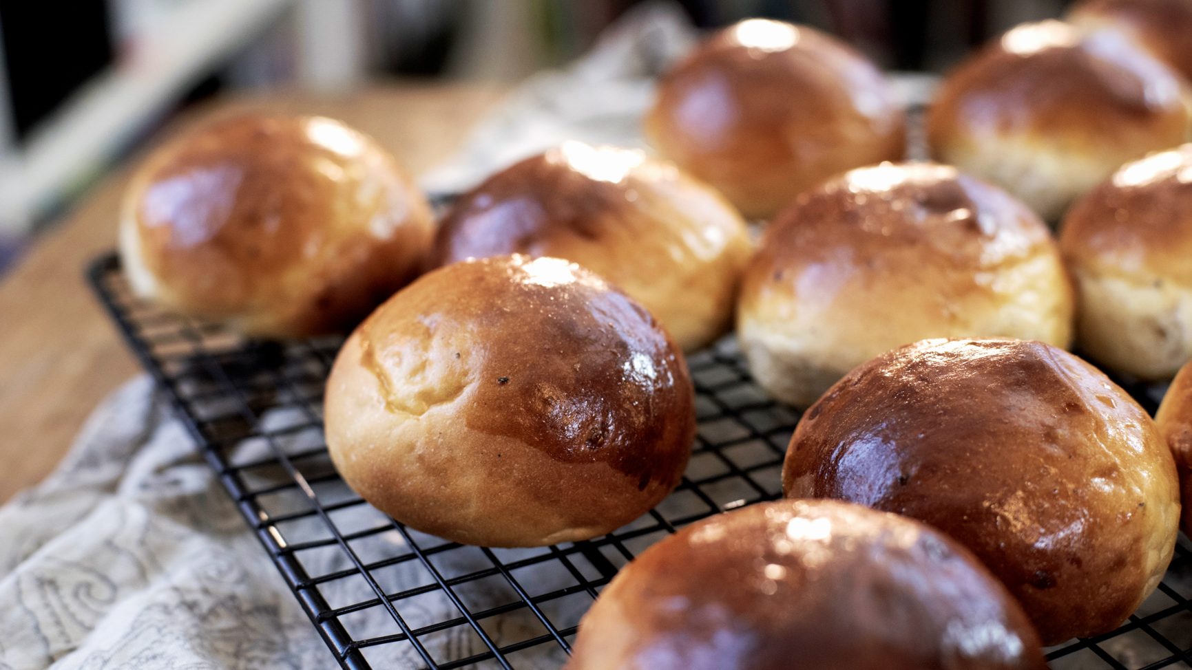 Etterheves i cirka 30 minutter. - Pensle bollene med et sammenpisket egg og stek dem på 220 grader midt i ovner i cirka 12 minutter.